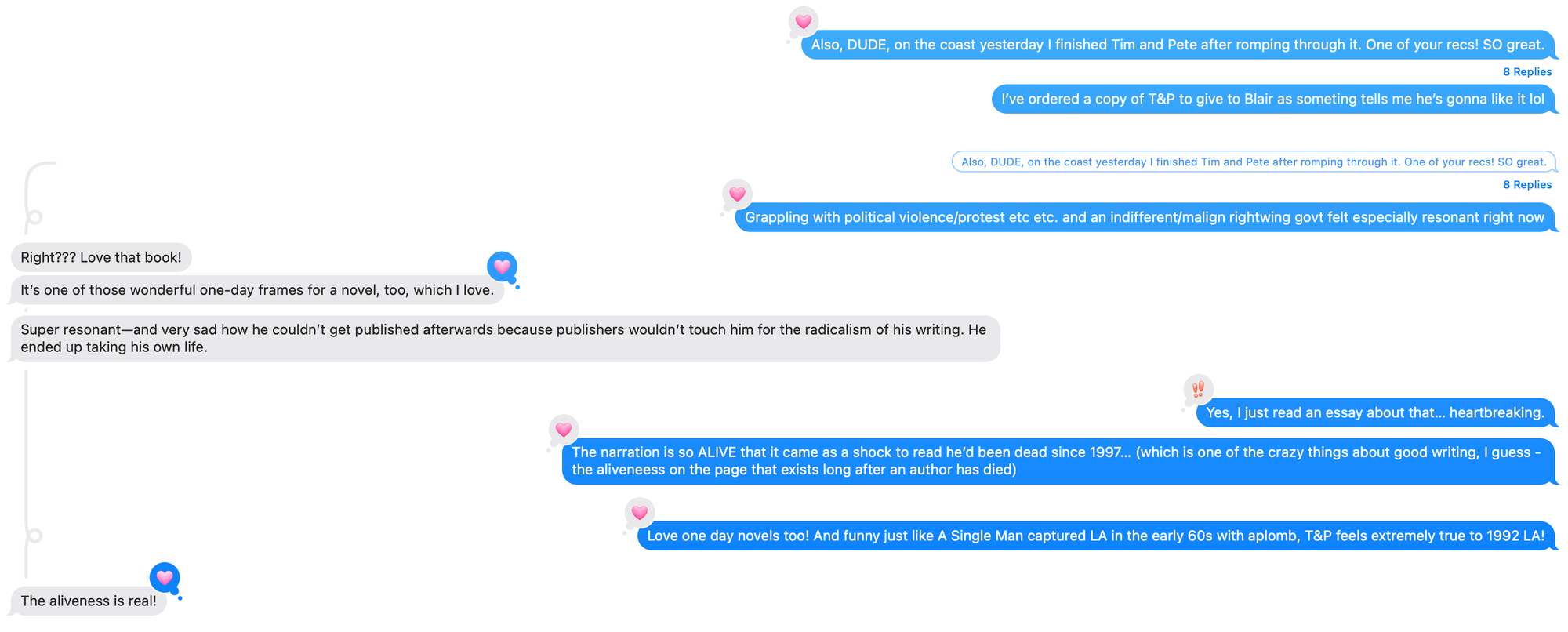 My friend Vincent recommended the novel Tim and Pete to me and I'm so glad he did! Here's a text exchange with him shortly after finishing it: