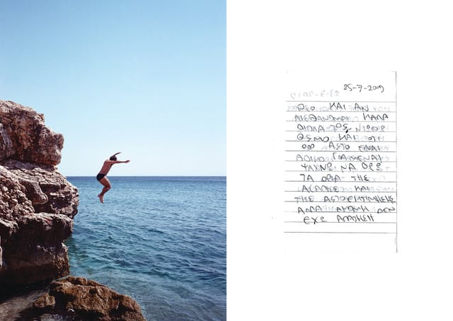 Over the span of 176 matte pages, Dimitris's photographs are interspersed with reproductions of notes he'd taken that summer (helpfully translated into English). In combination, the result is a vivid and melancholy evocation of a difficult and heady summer – a story that is both achingly nostalgic and punchily immediate (not unlike when you catch a whiff of a fragrance that reminds you of someone you loved long ago).