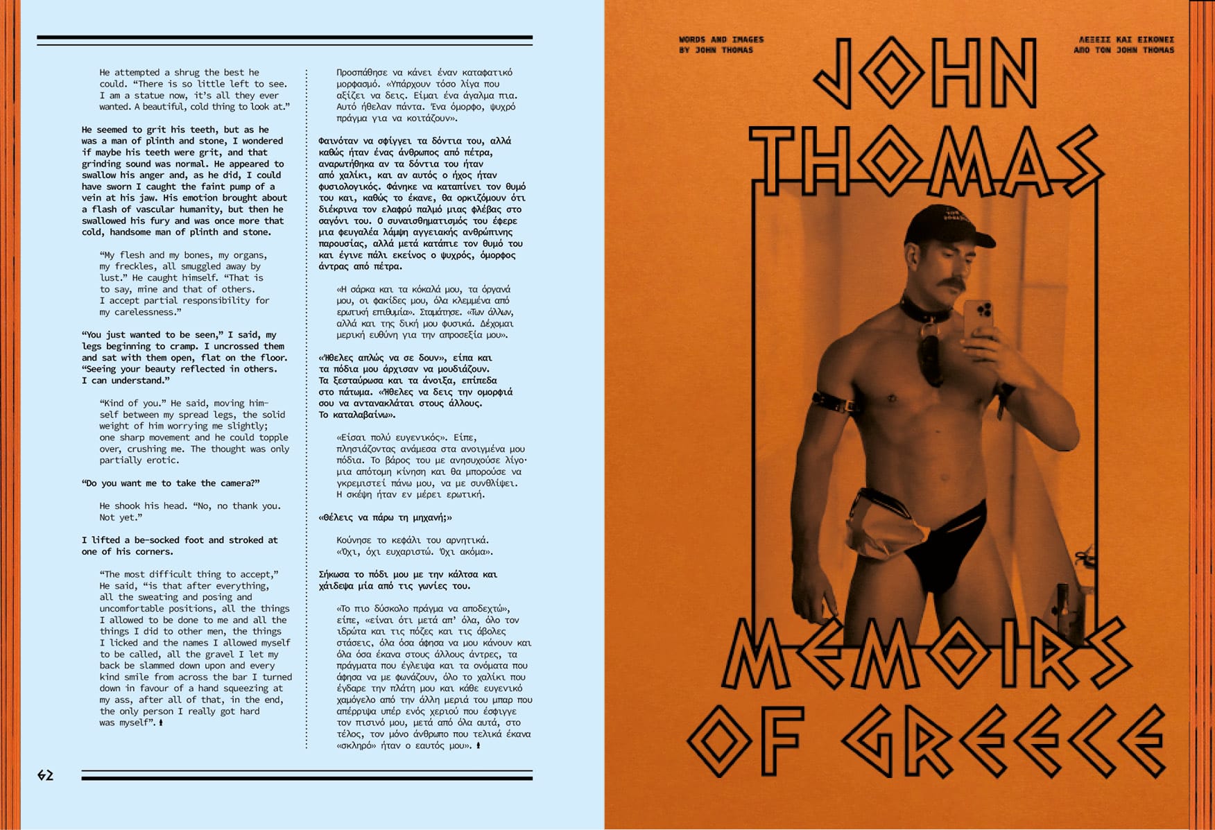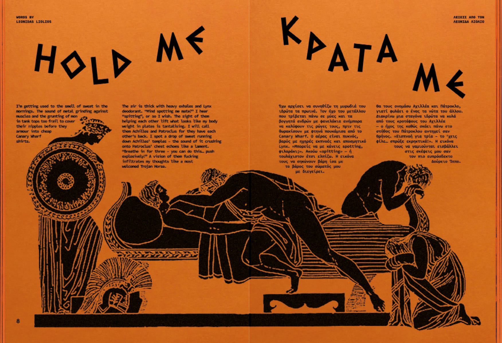 LL: Growing up, I didn’t know what queer love sounds like in my own language. It’s a strange concept to perceive, but imagine not knowing how two men would speak to each other in an intimate setting. The only Greek words that I knew that would relate to what I was figuring out to be my identity were either hurtful slurs or sexist and derogatory phrases. The one time there was a kiss between two men on television in Greece, the channel that aired it was fined twenty thousand euros. I was too young to even remember this and so my initiation to queer culture was through foreign tv shows like Queer As Folk and soft porn or full on porn Tumblrs. Cut to the lockdown and the OnlyFans boom that saw lots of Greek queers seeking for alternative sources of income or just a space to have some fun, we get to listen in to queers having sex in their own language, or were they? In a conversation for Issue #1 with OnlyFans performer IacovosOnly, he stated how he caught himself saying that word “fuck” all the time, and how that’s probably because he was only ever able to consume English gay porn. So, Greek is the language of trauma and not the language of queer love for many of us, which is totally ironic given our history. Our mission and the reason why it is so important for the magazine to be bilingual, is that we get to claim back our ability to love in our own language.