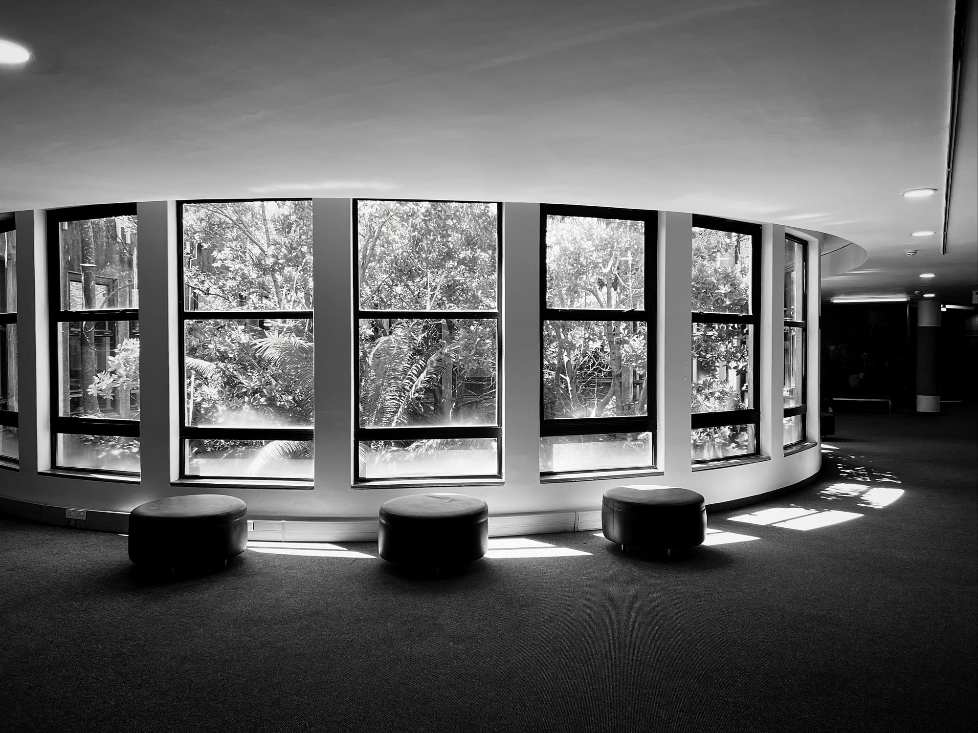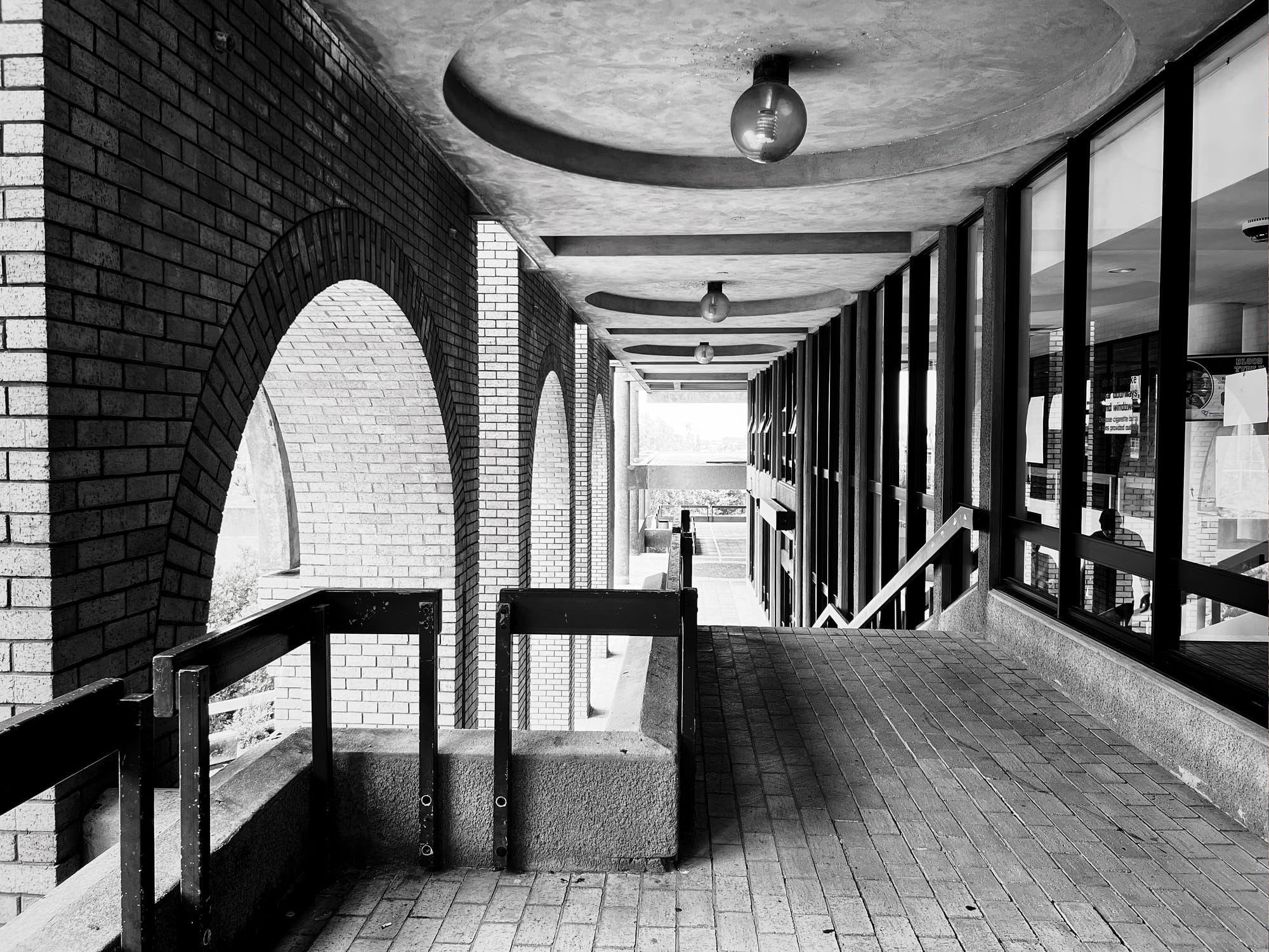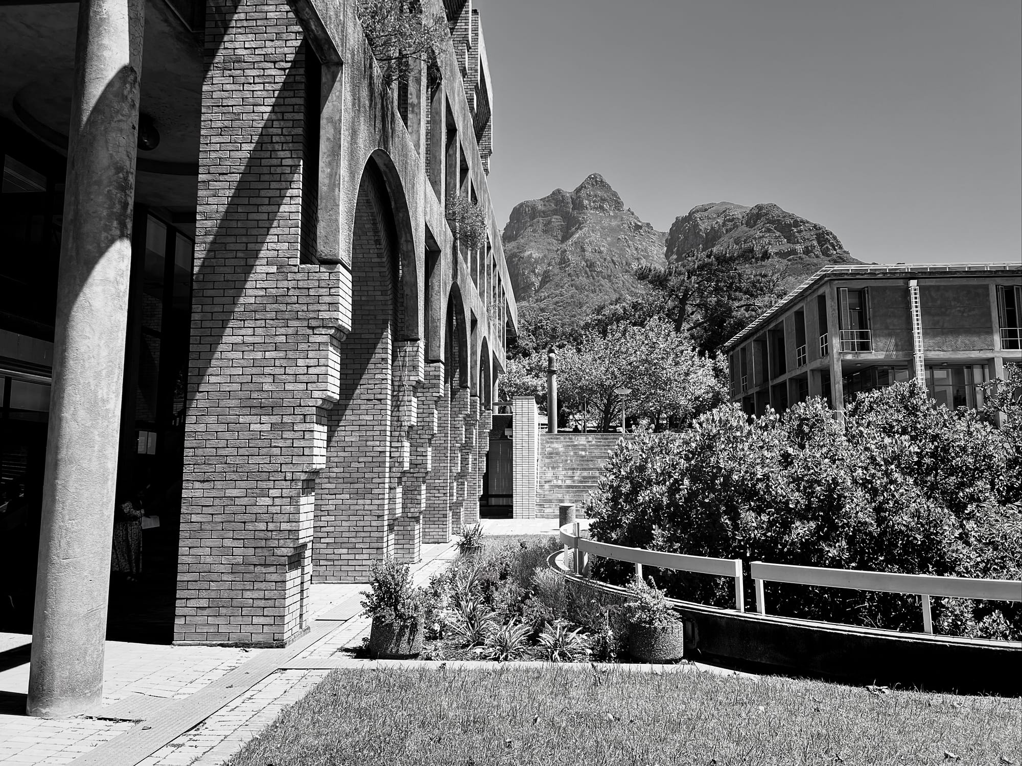 Anyway. This law student / novelist / amateur photographer is amused by how enchanted I am by the Kramer Building, a 1984 face brick and concrete edifice housing UCT's law faculty on the university's Middle Campus. Amused because I suspect my younger (that is, teenaged) self would've found it drab, dour, cringy, "dated". The 2026 me finds it sexy without trying to be. (Hence the compulsive picture-taking.) A faded, unassuming, self-possessed modern. At the very, very outer edge of the mid-century, before it teeters off into post-modern insanity. I looked up when it was built: 1984, apparently. (So, not really mid-century at all.) Helvetica everywhere (now, that is modern). A smattering of art. And delightful plants, inside and outside, too.