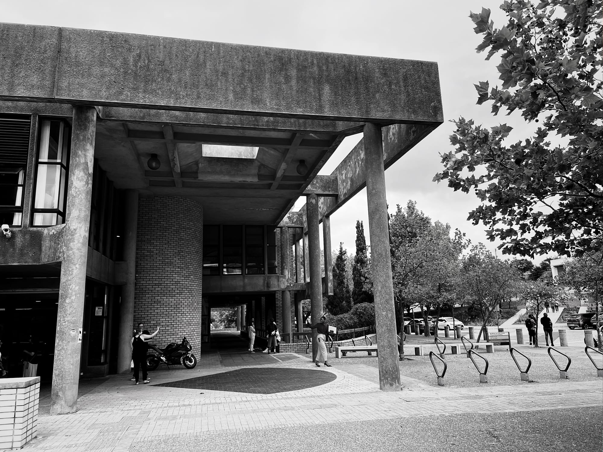Anyway. This law student / novelist / amateur photographer is amused by how enchanted I am by the Kramer Building, a 1984 face brick and concrete edifice housing UCT's law faculty on the university's Middle Campus. Amused because I suspect my younger (that is, teenaged) self would've found it drab, dour, cringy, "dated". The 2026 me finds it sexy without trying to be. (Hence the compulsive picture-taking.) A faded, unassuming, self-possessed modern. At the very, very outer edge of the mid-century, before it teeters off into post-modern insanity. I looked up when it was built: 1984, apparently. (So, not really mid-century at all.) Helvetica everywhere (now, that is modern). A smattering of art. And delightful plants, inside and outside, too.